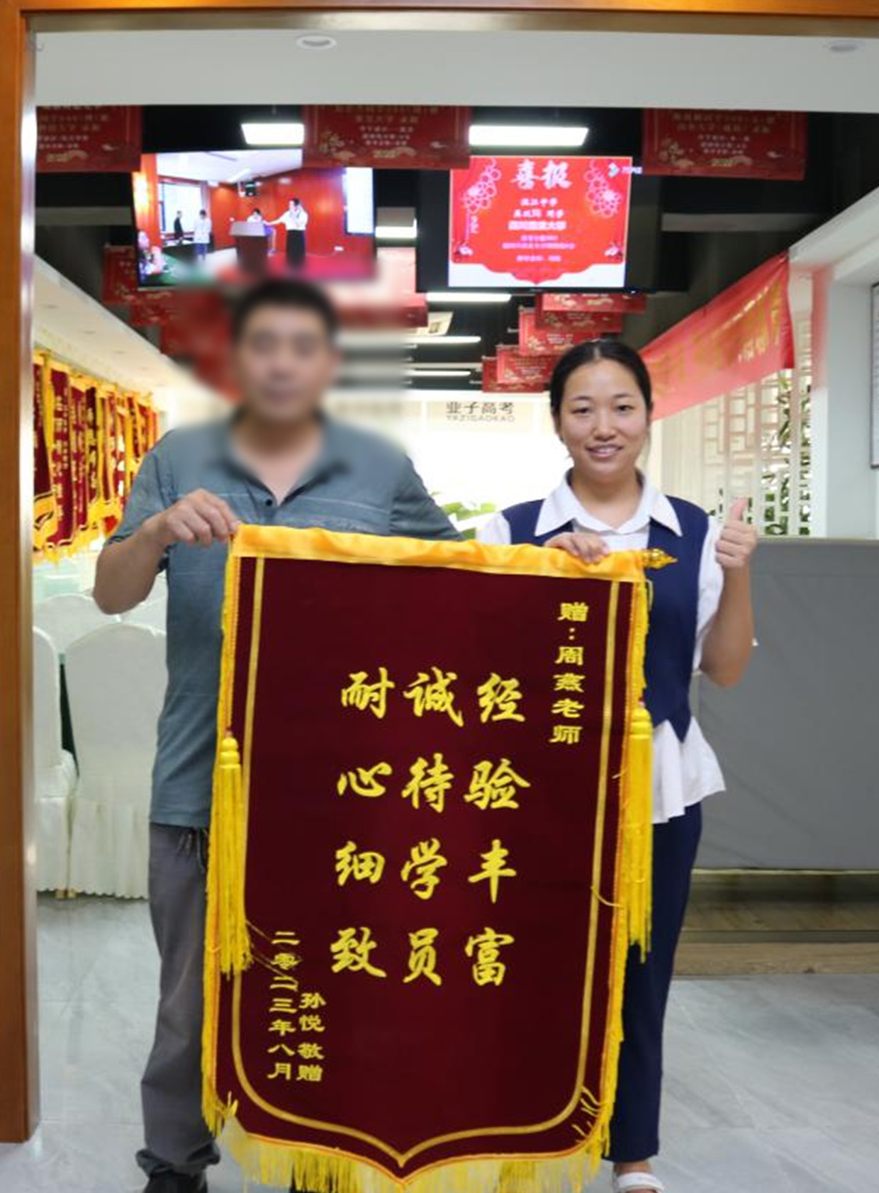 出分后孙*同学的妈妈把分数发给了周老师,考了473分,分数挺尴尬的,公办学校的概率很小,所以出分后第一次来拿方案时孙*同学的爸妈很纠结,本来想让孙*同学读公办,但是新疆西藏太偏远的又不想去,川渝学校收分又高,所以让孙*同学接受了冲职业本科教育的思路,但其实孙*同学不太愿意,所以第一次拿走方案后思考了一晚上,又约了第二天晚上时间调整方案,取消了职业本科教育的学校,改为公办普通专业,冲公办,民办垫底。最后录取到成都锦诚学院,地区在成都,满足了一家人的需求,专业也是孙*同学喜欢的,都很满意,孙*同学的爸爸过来给周老师送锦旗以表感谢,聊到家里邻居孩子同样的分数去了外省民办,感觉很亏!